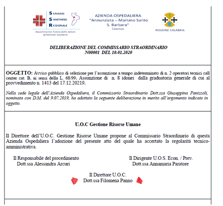 Si arricchisce di nuovi inquietanti particolari il concorso-truffa per l’assunzione di operatori call center all’ospedale dell’Annunziata di Cosenza alla vigilia della competizione elettorale regionale, andata in scena il 26 gennaio. Dopo un lungo torpore, si è addirittura svegliata l’Azienda Ospedaliera di Cosenza, che ha decretato la nullità dell’incarico conferito alla dottoressa Filomena Panno, direttore dell’UOC Gestione Risorse Umane che si era occupata di dar vita a questa grandissima truffa (http://www.iacchite.blog/cosenza-azienda-ospedaliera-via-la-panno-dallunita-gestione-risorse-umane-saranno-annullati-i-concorsi-truffa/).