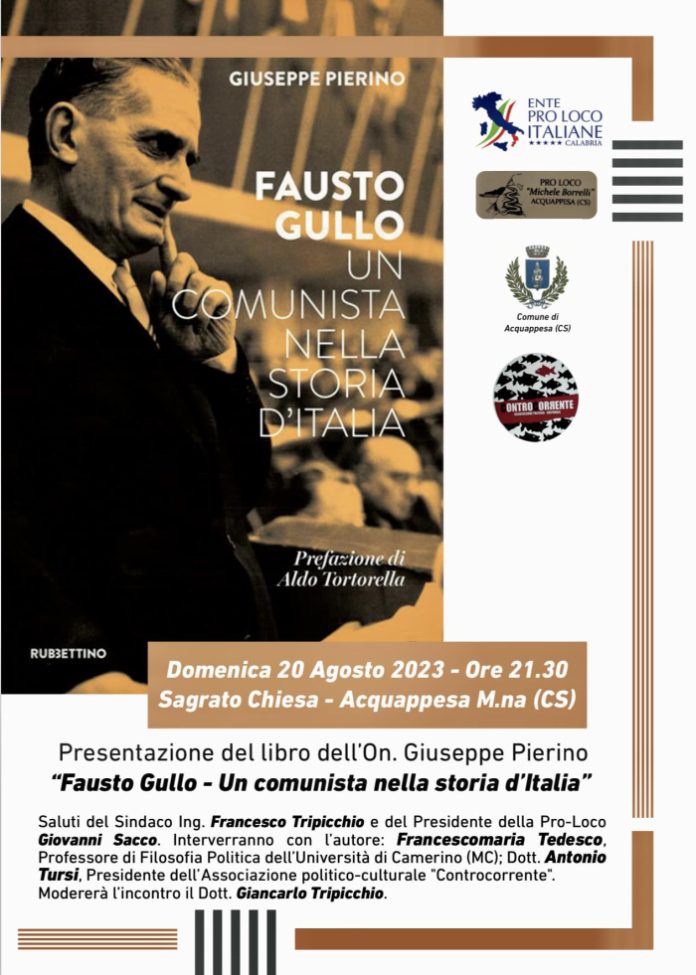 Si terrà domani sera, venerdì 25 agosto (dopo il rinvio di domenica scorsa), con inizio alle ore 21.30, sul sagrato della chiesa di Acquappesa Marina, la presentazione del libro di Giuseppe Pierino dal titolo “Fausto Gullo, un comunista nella storia d’Italia”.
