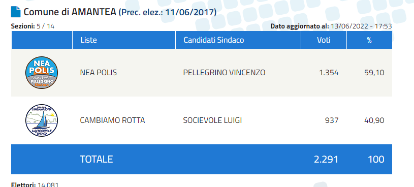 Amantea, 5 sezioni su 14: Pellegrino 59,1%, Socievole 40,9%