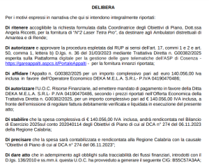 La notizia era passata sotto silenzio per il gran casino della dichiarazione dello stato di emergenza del sistema ospedaliero calabrese ma rifletteva e riflette ancora in pieno lo stato delle cose. L’Asp di Cosenza ha acquistato due laser Tetra Pro da destinare ai Poliambulatori distrettuali di Amantea e di Rende alla modica cifra di 140 mila euro cadauno per un totale di oltre 280 mila euro. L’operazione è stata giustificata con gli “Obiettivi di Piano” inseriti nei fondi Pnrr ed è semplicemente assurda per come è stata concepita.