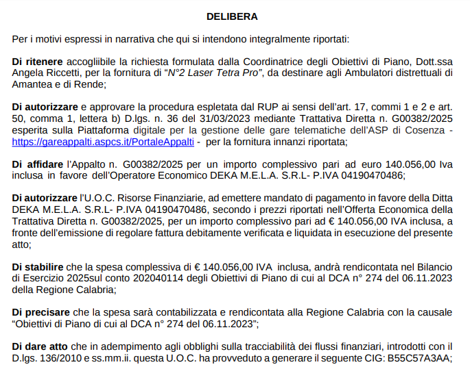 E non è finita, perché – come si legge nella determina – i due laser sono stati forniti da una impresa, la Deka, che in Calabria ha un agente che risponde al nome di Massimo Bozzo ed è facilissimo “scoprire” che questo signore altri non è che il segretario cittadino di Forza Italia a Cosenza nonché storico galoppino dei fratelli Occhiuto. Si parla di 280 mila euro + Iva di affidamento diretto, senza neanche lo straccio di una gara: una forzatura grande quanto una casa. E non c’è bisogno né di un profeta e né di una zingara per capire che questi laser saranno utilizzati per favorire la “solita” attività privata di questi mascalzoni che giocano sulla salute delle persone.