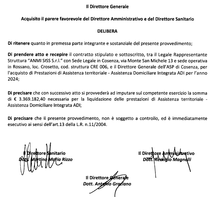 Praticamente, il direttore generale dell’Asp di Cosenza, Antonello Graziano, di concerto con il presidente della Regione Calabria, Roberto Occhiuto, hanno disposto l’affidamento “diretto” di prestazioni sanitarie pubbliche di Adi (Assistenza Domiciliare Integrata), per l’importo di € 3.369.182,40 (tre milioni trecentosessantanove mila euro!!!), in favore di ANMI SISS srl, la gallina dalle uova d’oro di proprietà di Di Tommaso Michele e di Potestio Carmine, giusta Delibera n. 479 del 1º marzo 2024 di presa d’atto, allegata (che vedete sopra e sotto).