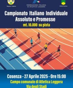 Venticinque giri di pista, quattro titoli in palio: è Cosenza a ospitare i Campionati Italiani dei 10.000 metri nel pomeriggio di domenica 27 aprile (ore 15,30). La rassegna mette in palio le maglie tricolori assolute e promesse, ed è compresa tra gli eventi che possono dare indicazioni per definire il team azzurro in vista della Coppa Europa dei 10.000 in programma a Pacé, in Francia, il 24 maggio.
