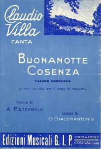 Ma c’è anche di più, “Buonanotte Cosenza” doveva essere anche la colonna sonora del film LA SILA NON E’ TERRA DI BRIGANTI tratto dall’omonimo libro di Salvatore Sicilia. il film non fu poi realizzato ma la canzone ebbe un grande successo, anche nazionale. BUONANOTTE COSENZA CANTATA DA CLAUDIO VILLA