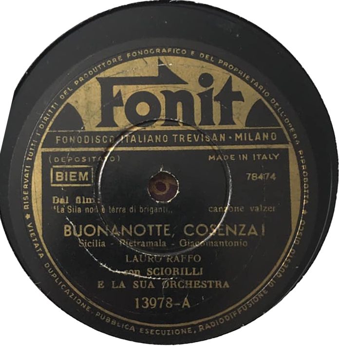 La prima incisione di BUONANOTTE COSENZA a 78 giri risale dunque ai primi anni ’50 del e in rete circola anche il disco della FONIT, che si assunse l’incarico di registrarla con l’orchestra Sciorilli e con la voce di Lauro Raffo, che quindi è stato il primo cantante “ufficiale” del brano.