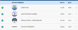 CONSIGLIERI ELETTI – FORZA ITALIA Salvatore Cirillo 19.225; Mimmo Giannetta 10.452 LEGA: Giuseppe Mattiani 12.619 FRATELLI D’ITALIA Giovanni Calabrese 11.351 OCCHIUTO PRESIDENTE: Giacomo Crinò 9.036