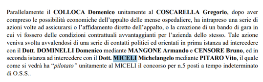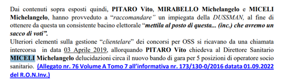 Non solo: la Dda su Michelangelo Miceli scrive senza giri di parole che il medesimo ha (ma noi utilizziamo il tempo verbale avrebbe) “pilotato” un concorso pubblico per O.S.S.