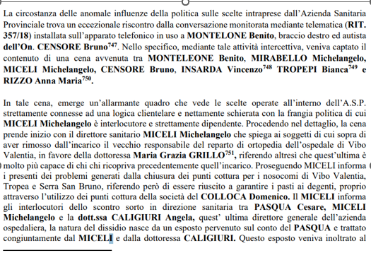 Premettendo che la posizione di Michelangelo Miceli è stata attualmente stralciata (ma mai archiviata), la Dda nei suoi confronti è netta. Nel provvedimento di fermo reso nell’ambito dell’inchiesta “Maestrale-Carthago” dell’8 maggio 2023, la Dda di Catanzaro guidata allora da Nicola Gratteri parla di “anomale influenze” della politica sull’Azienda sanitaria provinciale di Vibo Valentia inserendo il nome di Michelangelo Miceli tra i protagonisti di un “allarmante quadro” connesso a una “logica clientelare” strettamente connessa alla parte politica del Miceli (corrispondente al Partito Democratico).