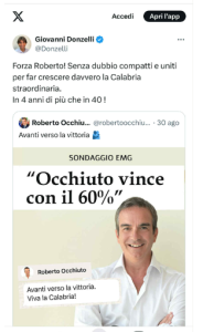 Quanto basta per far andare in sovraccarico e quasi in crisi isterica il povero Robertino e il suo entourage. E così, intorno a mezzogiorno, è uscito fuori un tweet di Giovanni Donzelli, braccio destro di Giorgia Meloni, con il quale qualcuno dice che la partita a favore di Occhiuto è chiusa. Il tutto in clamorosa contrapposizione a quanto scrive L’Espresso. Si vedrà dove sta il reale e dove la propaganda.