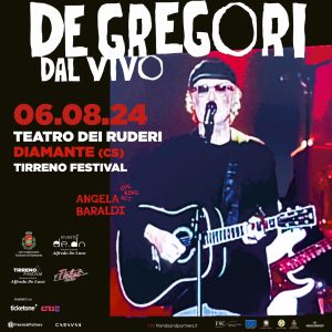 Francesco De Gregori è fra i più popolari cantautori del panorama nazionale, nelle sue canzoni si incontrano musicalmente sonorità varie, dal rock alla canzone d’autore, con a volte riferimenti anche alla musica popolare, mentre nelle liriche c’è un ampio uso della sinestesia e della metafora, spesso di non immediata interpretazione, con passaggi di ispirazione intimista, letterario-poetica ed etico-politica in cui trovano spazio riferimenti all’attualità e alla storia. L’opening act del live sarà curato da Angela Baraldi. De Gregori torna a calcare il palcoscenico più prestigioso della riviera dei Cedri, fortemente voluto nella programmazione 2024 dal Direttore artistico Alfredo De Luca.