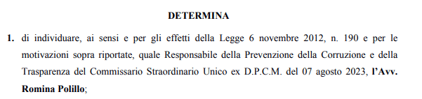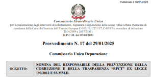 Con Provvedimento n. 17 del 29 gennaio 2025, è stata designata come Responsabile della Prevenzione della Corruzione e della Trasparenza (RPCT) del Commissario Straordinario Unico per la Depurazione Nazionale, ai sensi della Legge 6 novembre 2012, n. 190 (norma anticorruzione). La nomina è avvenuta nel quadro degli adempimenti obbligatori delle amministrazioni pubbliche in materia di anticorruzione e trasparenza.