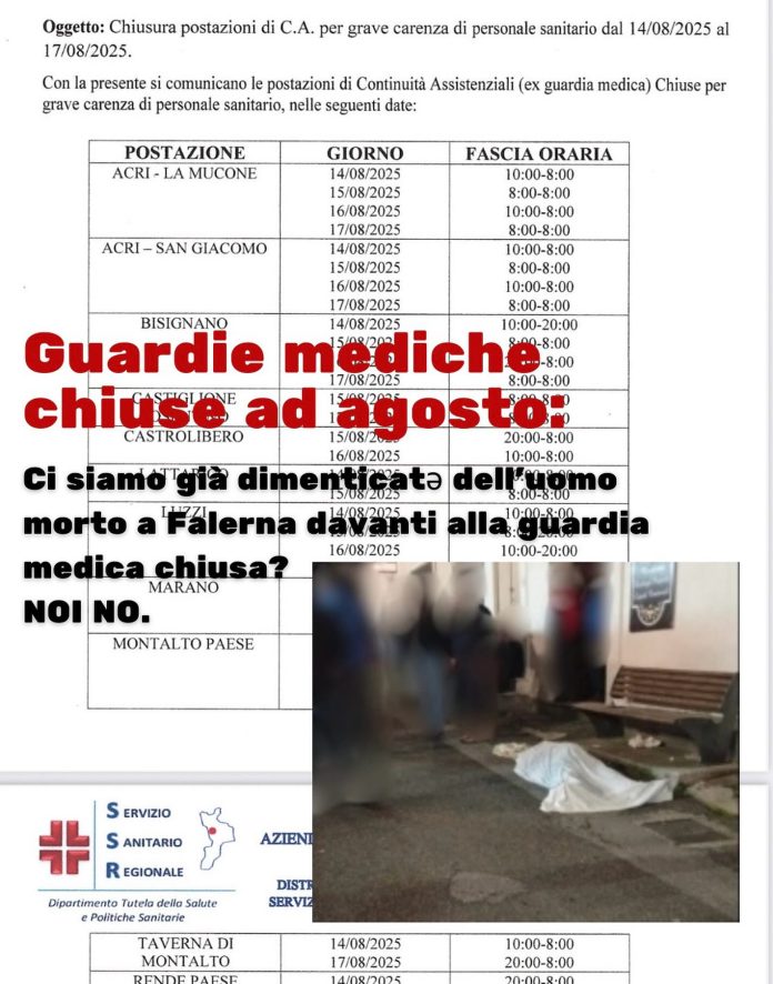 La chiusura delle postazioni di Continuità Assistenziale, per carenza di personale, in numerosi paesi della provincia di Cosenza è un atto gravissimo ai danni del diritto alla salute dei cittadini calabresi. In un periodo in cui la popolazione di molte località quadruplica per il rientro degli emigrati e per l’afflusso turistico, privare intere comunità della guardia medica significa esporle a rischi enormi. La guardia medica è essenziale non solo per gestire le emergenze notturne e festive, ma anche perché molti medici di base sono in ferie e i pronto soccorso già al collasso.