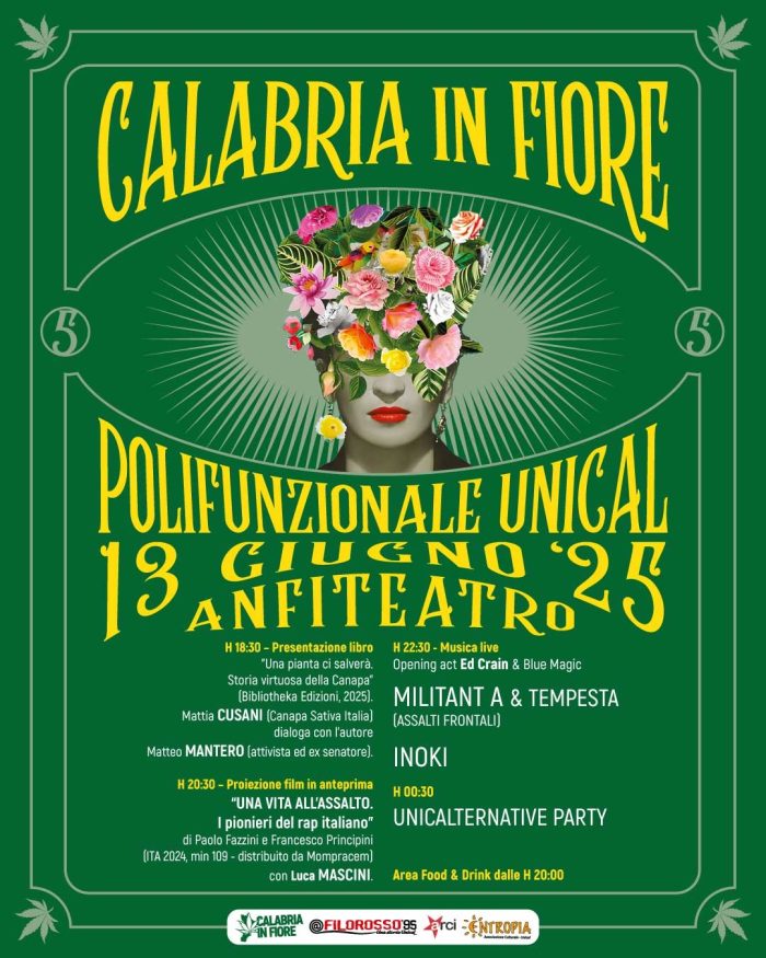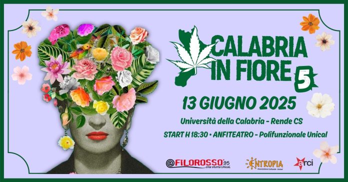 Un festival resistente come la fibra di canapa. Torna a Rende domani venerdì 13 giugno Calabria in Fiore, evento antiproibizionista del Filorosso organizzato in collaborazione con Entropia APS e ARCI. La quinta edizione è concentrata in un’unica giornata, si svolgerà interamente presso l’Anfiteatro del Polifunzionale Unical e prevede come sempre una combinazione di linguaggi culturali ed artistici, utili a stimolare la riflessione sui diritti e le libertà individuali e collettive in Italia, in particolare alla luce delle recenti restrizioni in materia (decreto anti-rave, decreto Caivano, codice della strada e decreto sicurezza).