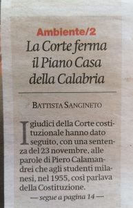 La Corte costituzionale non ha lasciato la Carta in terra, ma ha mantenuto quelle promesse e quella responsabilità muovendosi per bocciare la legge del 2 luglio del 2020, n. 10, recante “Modifiche e integrazioni al Piano Casa (l. r. 11 agosto 2010, n. 21)”, varata dalla giunta regionale della Calabria. Secondo la sentenza di pochi giorni fa la Regione Calabria avrebbe voluto, con questa legge, sostituirsi “alla competenza legislativa esclusiva statale in materia di tutela dell’ambiente venendo meno al principio di leale collaborazione e dando vita ad un intervento regionale autonomo al posto della pianificazione concertata e condivisa (con la Soprintendenza, n.d.r.), prescindendo da questa e superandola, peraltro smentendo l’impegno assunto nei confronti dello Stato di proseguire un percorso di collaborazione”. Così facendo si sarebbe vanificato il potere dello Stato nella tutela dell’ambiente, rispetto al quale il paesaggio assume valore primario e assoluto, in linea con l’art. 9 della Costituzione. Secondo la relatrice della sentenza, Silvana Sciarra, le previsioni della quantità di cemento versato avrebbero finito per danneggiare il territorio in tutte le sue componenti e, primariamente, nel suo aspetto paesaggistico e ambientale, in violazione dell’art. 9. Secondo la Corte tale lesione era resa più grave dalla circostanza che, in questo lungo lasso di tempo (il protocollo d’intesa fra Mibact e Regione Calabria è del 23 dicembre 2009, n.d.r.), non si è ancora proceduto all’approvazione del piano paesaggistico regionale, ma solo al temporaneo Quadro territoriale regionale a valenza paesaggistica (Q.T.R.P.) che la giunta Oliverio non è stata capace di trasformare, come prescriveva il d.lgs. 22 gennaio 2004, n. 42, nel definitivo “Piano paesistico”.