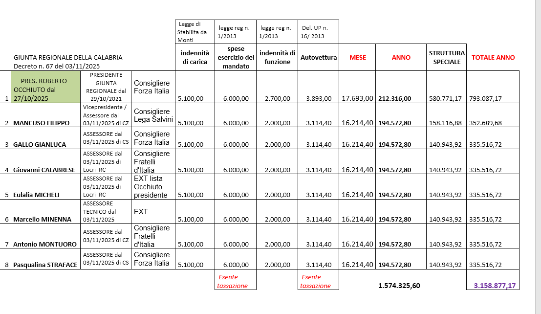 1. Luciano VIGNA di CS dal 03/11/2025 confermato Capo di Gabinetto di Occhiuto a titolo gratuito perché direttore generale ARRICAL dal 29/10/2025 con indennità di € 1.781.478,37;