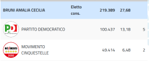 Passando alla coalizione di centrosinistra, Amalia Bruni ha riportato circa 219.000 voti ovvero circa 11.000 in più di quelli di partiti e movimenti che l’hanno sostenuta e anche in questo caso vi diamo i dettagli. Il Pd in particolare si era attestato intorno al 13% e il M5s al 6,5%.
