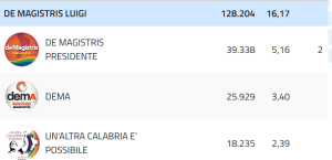 Anche aggiungendo al centrosinistra i voti riportati dal terzo competitor di allora ovvero Luigi De Magistris – che furono circa 128.000, 13.000 in più di quelli delle liste che l’hanno sostenuto -, la coalizione progressista non riuscirebbe a stare al passo della coalizione di centrodestra. Sempre ammesso che quei voti andassero tutti al centrosinistra e non è affatto detto, visto che chi votò De Magistris, a Tridico e al Pd ce li ha, con decenza parlando, sugli zebedei. Quanto ad Avs, 4 anni fa Lucano si era candidato con una civica che prese il 2,39%… Ecco comunque il dettaglio.