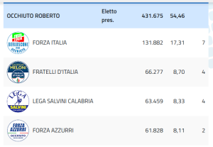 A beneficio di chi non li ricordasse, riportiamo i dati che documentano l’esito delle elezioni regionali in Calabria del 2021. Roberto Occhiuto ha vinto con oltre 430 mila voti di preferenza, circa 6 mila in più di quelli della sua coalizione, guidata nettamente da Forza Italia, che in pratica ha doppiato con il suo 17% Fratelli d’Italia e Lega, che hanno riportato poco più dell’8%.