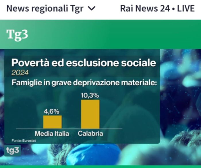 Ieri sera, la terza rete della RAI, ha diffuso dati terrificanti sulla povertà dei bambini italiani, soprattutto, di quelli calabresi e sulla deprivazione in Calabria, precipitata, negli ultimi 5 anni, all’ultimo posto in Europa per fame. Soprattutto, ci comunica un dato che impone, alla parte viva della società Calabrese, di prepararsi alla lotta estrema per la sopravvivenza, come i Palestinesi a Gaza.