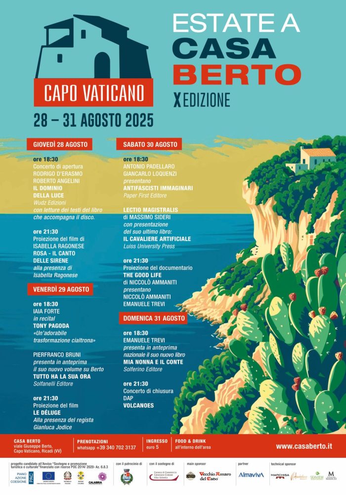 Ultimi quattro giorni di agosto 2025, Capo Vaticano è palco speciale per “Estate a Casa Berto”: dal 28 al 31 agosto, e con un appuntamento extra il 20 settembre, il “family festival” tra i più amati dell’estate italiana, festeggia la sua decima edizione con un programma che accoglie scrittori, giornalisti, musicisti, artisti, attori e registi nella dimora a picco sulla Costa degli Dei, che fu rifugio creativo e luogo dell’anima di Giuseppe Berto.