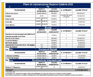 La linea d’intervento è la numero 6 che viene definita: “Promozione e valorizzazione del brand Calabria Straordinaria”. Il presidente Occhiuto, dopo aver puntato per anni sui cosiddetti 100 Marcatori Distintivi Identitari spendendo milioni su milioni, ha capito che questi davano poco lustro alla sua immagine e si è buttato a pesce sulla promozione turistica affidata ai grandi gruppi televisivi: Rai, Mediaset, Cairo editore. Tutte campagne costose, dal facile ritorno di immagine ma di poca incisività sui flussi turistici.