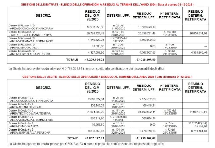 Un’ulteriore criticità riguarda la delibera di Giunta n. 78/2025, con la quale sono stati approvati i residui attivi e passivi riportando numeri diversi rispetto a quelli approvati con determinazione dagli uffici competenti. Le differenze tra la delibera di Giunta e i dati degli uffici sono enormi. Infatti, la Giunta ha approvato residui attivi pari a 5.788.301,34 euro e residui passivi pari a 603.334,73 euro in meno rispetto alla certificazione dei responsabili degli uffici. Così facendo, si sta falsificando un bilancio di rendiconto che dovrebbe essere una fotografia fedele dello stato delle casse comunali. La Giunta comunale, per legge, quale organo politico, non può sostituirsi all’apparato burocratico e non ha il potere di modificare i numeri approvati dagli uffici.
