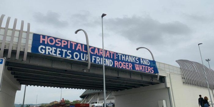 Ph_ 📷_: Bologna 2023, uno striscione sistemato davanti l’Unipol Arena da parte dei migranti cariatesi
