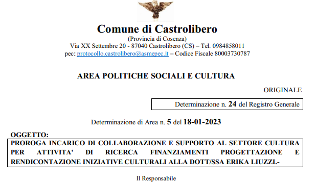 Il comune di Castrolibero la presenta alle associazioni che operano sul territorio come referente per ogni informazione sui bandi (in via del tutto informale ovviamente) ed alcune di queste associazioni sono anche stufe di questo monopolio.
