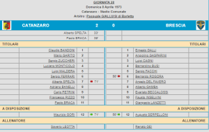Visto che ci siamo, ricordiamo anche i precedenti due successi del Catanzaro sul Brescia conquistati però al vecchio “Militare”. Nel 1972-73 i giallorossi vinsero 2-0 grazie ai gol di Spelta e Braca in una partita che rimase agli annali e che è stata anche ricordata di recente da Evaristo Beccalossi, capo delegazione della Nazionale Under 20, in occasione di Italia-Polonia giocata al “Ceravolo”. Beccalossi, in particolare, ricordò che quella partita è stata il suo esordio assoluto in Serie B alla tenera età di 16 anni. Ma ricordò soprattutto che dopo aver scartato Ginone Maldera si era sentito dire: “Se lo fai di nuovo, ti dò un calcione e ti mando a Soverato”. Una volta appurato che Soverato si trovava a circa 20 km da Catanzaro – glielo aveva detto il suo vecchio compagno di squadra Salvi – Evaristo sparì praticamente dalla scena e ancora oggi sorride divertito.