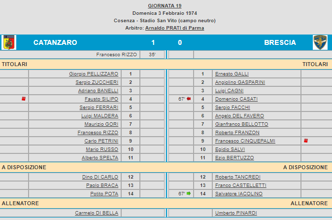 Ma torniamo a Catanzaro-Brescia. Quella volta che si giocò a Cosenza era il 3 febbraio del 1974, campionato di Serie B. Un torneo che non riservò molte soddisfazioni al Catanzaro, costretto addirittura a lottare per la salvezza dopo che nella stagione precedente aveva mancato la seconda promozione in A solo per una manciata di punti. Il capitano dei giallorossi, poi, era un cosentino purosangue come Franco Rizzo (recentemente scomparso), ingaggiato dal presidente Ceravolo dopo la retrocessione del 1972, primo calabrese a indossare la maglia azzurra della Nazionale dopo una serie di grandi campionati con il Cagliari di Gigi Riva e a laurearsi Campione d’Italia con la Fiorentina nel 1969.