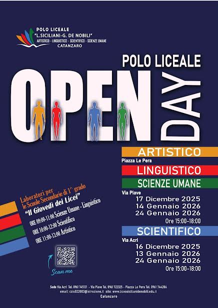 Il Polo Liceale “L. Siciliani – G. De Nobili” di Catanzaro, che comprende i percorsi Artistico, Linguistico, Scientifico e delle Scienze Umane, organizza diverse giornate di Open Day e laboratori orientativi rivolti agli studenti delle Scuole Secondarie di primo grado e alle loro famiglie, al fine di presentare l’ampia offerta formativa e accompagnare la scelta della scuola superiore per l’anno scolastico 2025/2026.