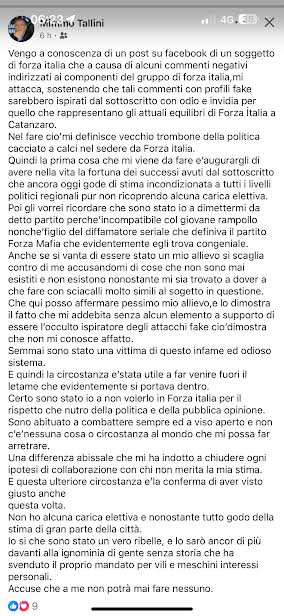 Fin qui Sergio Costanzo. Adesso ci occupiamo della replica di Mimmo Tallini, che ovviamente non è rimasto in silenzio davanti alle accuse dell’ex amico e ha scritto un post al vetriolo. A Catanzaro si dice che ci siano interessi abbastanza facili da intuire per fomentare questo scontro tra Tallini e Costanzo, magari per distogliere l’attenzione dalla governance di Forza Italia a Catanzaro che fa acqua da tutte le parti… Ma Tallini, che non è fesso, ha coinvolto un po’ tutti nel suo post di ieri sera e a molti staranno fischiando le orecchie… Di seguito, il post di Tallini.