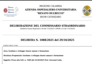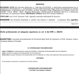 Il Decreto del Rettore, sottoscritto dal Prorettore Vicario Professore Francesco Saverio Costanzo direttore della stessa Biochimica Clinica andato poi in pensione il 1° novembre 2025, è del 22.10.2025. Il decreto è un insieme vergognoso di conflitti di interessi e di violazioni, con il Consiglio della Scuola di Medicina che propone il conferimento dell’incarico di direttore di struttura complessa del Professore Cuda… allo stesso Rettore Professore Cuda.