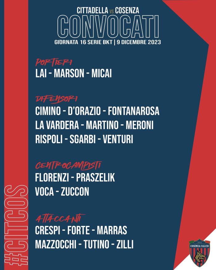 Di seguito i convocati (corredati dal numero di maglia) partiti questa mattina per la gara tra Cittadella e Cosenza  valida per la sedicesima giornata del Campionato di Serie BKT  in programma sabato 9 dicembre allo stadio “Tombolato”  con fischio d’inizio alle ore 14:00.