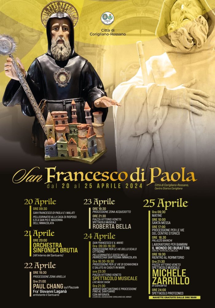 La tradizionale festa religiosa in onore di San Francesco di Paola, organizzata dal Comune di Corigliano-Rossano con i Padri Minimi, il Consiglio Religioso e la Commissione Festa Parrocchiale, che si chiuderà oggi, 25 april, ha visto alternarsi momenti legati al culto e alla devozione a musica e intrattenimento.