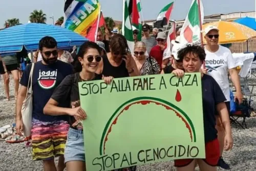 Poi è iniziata la marcia: un lungo e colorato corteo in acqua, con striscioni e bandiere, accolto da centinaia di bagnanti. Applausi, slogan, saluti calorosi: un grande abbraccio collettivo che ha attraversato il nostro mare, arrivando simbolicamente fino a Gaza. Un gesto d’amore e solidarietà che parla più di mille parole.