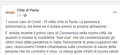 “1 nuovo caso di Covid -19 nella città di Paola. La persona è asintomatica, sta bene ed è isolata presso la propria abitazione.