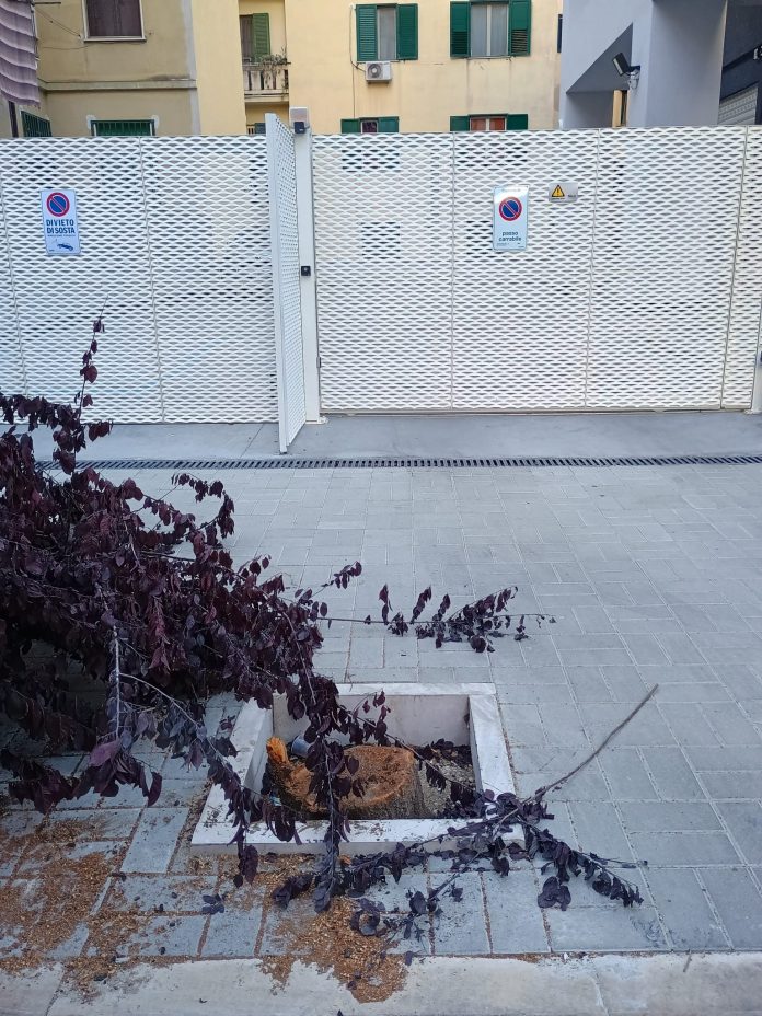 CHI AMMINISTRA LA CITTA? CHI MAI PUNIRA’ QUESTO SCEMPIO? Siamo in mano a dei bulli di quartiere, dei delinquenti che non si fanno remore di uccidere un rigoglioso albero perchè dà fastidio all’ingresso del “SUV” d’ordinanza nel prestigiooso garage di proprietà. Questo novello “Jesse James”del XXI secolo, non si nasconda nell’anonimato e metta la sua faccia per l’azione commessa. “Jesse James” l’avrebbe fatto. Non era uno squallido vigliacco. Il sindaco, l’assessore all’ambiente, le autorità proposte nulla hanno da dire? Quali azioni intendano prendere contro questi crimini, perchè uccidere un albero è commettere un crimine e dei più abberranti. E’ da questi gesti, che passano inosservati agli occhi dei più, che si misura la civiltà di una comunità. Devo dire che di civiltà e educazione in questa città se ne vede ben poca. Spero, (ma è solo una speranza figurarsi…), che si indaghi su chi ha abbattuto quest’albero e lo sanzioni nei termini di legge. Le multe non si fanno solo per divieto di sosta, o per non aver pagato l’obolo del parcheggio. Questo è un atto di una gravità eccezionale che si potrebbe ripetere più e più volte. All’anonimo figuro autore di questo oltraggio, posso solo dire VERGOGNATI.
