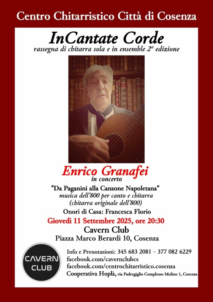 Si svolgerà presso il Circolo Arci Aprile Cavern Club, nel centro storico di Cosenza, giovedì 11 settembre alle ore 20,30, l’attesissimo concerto del musicista performer di origine cosentina Enrico Granafei dal titolo “Da Paganini alla Canzone Napoletana”. Si tratta di un omaggio alla musica dell’800 per canto e chitarra, con strumenti originali dell’epoca. L’evento rappresenta un’anteprima della seconda edizione di “Incantate corde”, fortunata rassegna ideata e guidata dal chitarrista e direttore artistico Roberto Scornaienchi.