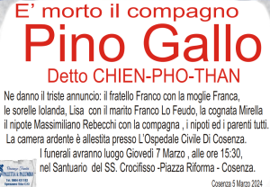Sarà celebrato giovedì alle ore 15 nel Santuario del Santissimo Crocifisso alla Riforma il funerale di Pino Gallo “Chien-Pho-Than”, figura storica della sinistra cosentina e artista di talento. I familiari informano gli amici che la camera ardente è allestita presso l’ospedale dell’Annunziata.