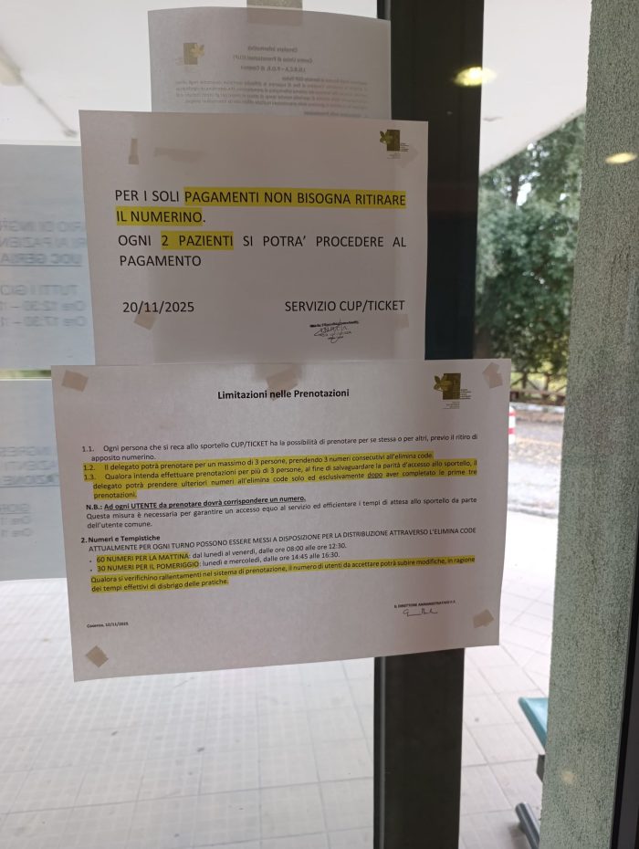 La nostra denuncia prende spunto da una recente comunicazione circolare emessa dal Cup locale, che introduce limitazioni insensate e di dubbia legittimità. Tale circolare, priva di numero di protocollo e della chiara identificazione del Responsabile del procedimento, appare un atto amministrativo debole e facilmente contestabile. In base a queste nuove disposizioni, un delegato di una struttura (come una casa di cura o un’associazione) può prenotare al massimo per tre pazienti alla volta. Dopo aver effettuato queste prime prenotazioni, deve necessariamente tornare in coda per ritirare nuovi numeri, se deve prenotare per altri pazienti. Immaginiamo una clinica privata che debba far analizzare decine di campioni biologici: i suoi operatori sono costretti a un pellegrinaggio kafkiano allo sportello, con un moltiplicarsi di code e una perdita di tempo inaccettabile, che di fatto ostacola deliberatamente l’accesso al servizio.