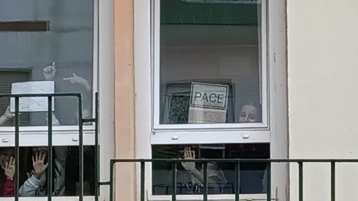 E poi il momento che resterà impresso. Quando il corteo passa davanti alla scuola di via Roma, dalle finestre spuntano mani, cartelli, applausi. I bambini salutano i manifestanti e alzano fogli con una sola parola: “Pace”. La folla risponde con un boato di emozione. Resta negli occhi quell’immagine che nessuna retorica potrà cancellare: i bambini affacciati alle finestre, con cartelli improvvisati e un’unica parola sulle labbra: “Pace”. Un grido semplice, disarmante, che pesa come un macigno. Ogni applauso che saliva dalle finestre era un filo invisibile che univa i piccoli studenti di Cosenza ai loro coetanei palestinesi. Oggi il coro più bello è stato quello che si è levato dalle aule dei piccoli studenti: un coro vero, sincero, pulito, che di certo è arrivato fino a Gaza.