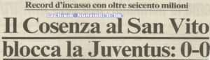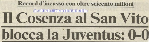 Domenica 21 agosto 1988 il Cosenza di Bruno Giorgi gioca la sua prima partita ufficiale nell’attesissima stagione della Serie B riconquistata nientepopodimenoche contro la Juventus di Dino Zoff, che in quegli anni però subisce lo strapotere del Milan di Sacchi e degli olandesi e del Napoli di Diego Armando Maradona. Ma è pur sempre una partita di cartello e infatti il record di incasso appena stabilito in Cosenza-Nocerina viene strabattuto: 19mila paganti e 608 milioni ai botteghini: un trionfo. La coreografia sarà una delle più belle di sempre con una “filarata” interminabile di fumogeni sistemata ai bordi del fossato che danno uno splendido effetto di “fuochi d’artificio” (sarebbe piaciuta molto all’attuale sindaco Occhiuto, che all’epoca non sapeva neanche dove fosse il San Vito e se la palla avesse una forma sferica…). La partita finirà a reti inviolate e per il Cosenza fu un successo incredibile, visto che non solo la squadra aveva contenuto gli attacchi dei vari Mauro, Rui Barros (marcato benissimo da un grande Bergamini) e Altobelli ma con Padovano era arrivata vicinissima al clamoroso gol della vittoria.