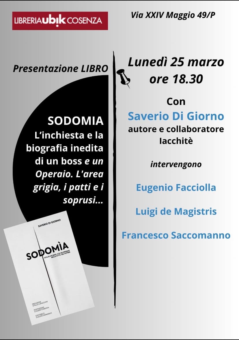 Oggi, lunedì 25 marzo ore 18.30 presso la libreria Ubik di Cosenza si parlerà di area grigia, di commistioni e di corruzione alla presentazione del libro SODOMiA-Vita di un Boss e di un Operaio nella Città del Potere. A interloquire con l’autore anche il procuratore Facciolla e Luigi De Magistris, oltre a Francesco Saccomanno.