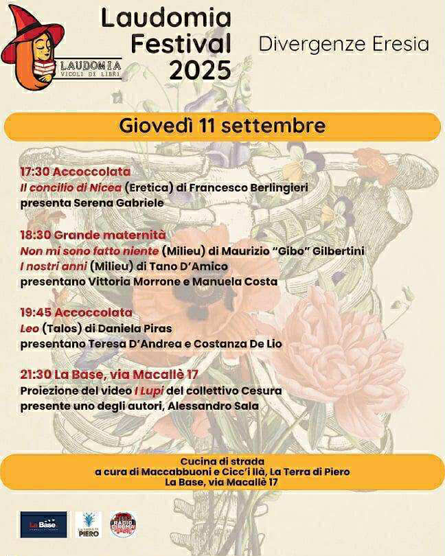 La giornata inaugurale (11 settembre), è dedicata alle origini dei dissensi e alle biografie in frizione con il canone. Francesco Berlingieri apre con Il concilio di Nicea (Eretica), racconto psichico della dissoluzione di un’epoca adolescenziale recente. A seguire Maurizio “Gibo” Gilberti con Non mi sono fatto niente (Milieu), un memoir di resistenza personale. Daniela Piras propone Leo (Talos), romanzo di formazione in cui la marginalità diventa forza narrativa. Chiude Tano D’Amico con I nostri anni (Milieu Edizioni), viaggio fotografico e civile dentro la memoria dei movimenti. In via Macallè si terrà, poi, la proiezione del video Lupi del collettivo Cesura alla presenza di Alessandro Sala che è uno degli autori.
