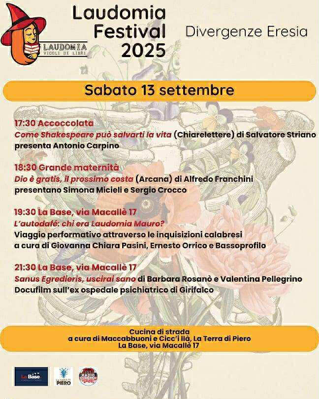 La giornata conclusiva (13 settembre), esplora l’eresia come pratica di riscatto individuale e collettivo. Salvatore Striano racconta il potere dei classici con Come Shakespeare può salvarti la vita (Chiarelettere). Alfredo Franchini propone Dio è gratis, il prossimo costa (Arcana), lampi saggistici tra etica, media e costume. A seguire il docufilm “Sanus egredieris, uscirai sano” di Barbara Rosanò e Valentina Pellegrino, centrato sull’ex ospedale psichiatrico di Girifalco. Gran finale con il viaggio performativo “L’autodafè: chi era Laudomia Mauro?” di Giovanna Chiara Pasini, Ernesto Orrico e Bassoprofilo, attraverso le inquisizioni calabresi, per riannodare storia, territorio e memoria delle “eretiche” del Sud. La giornata, però, si aprirà su via Macallè con il mercatino del Gas a cui seguirà il pranzo sociale.