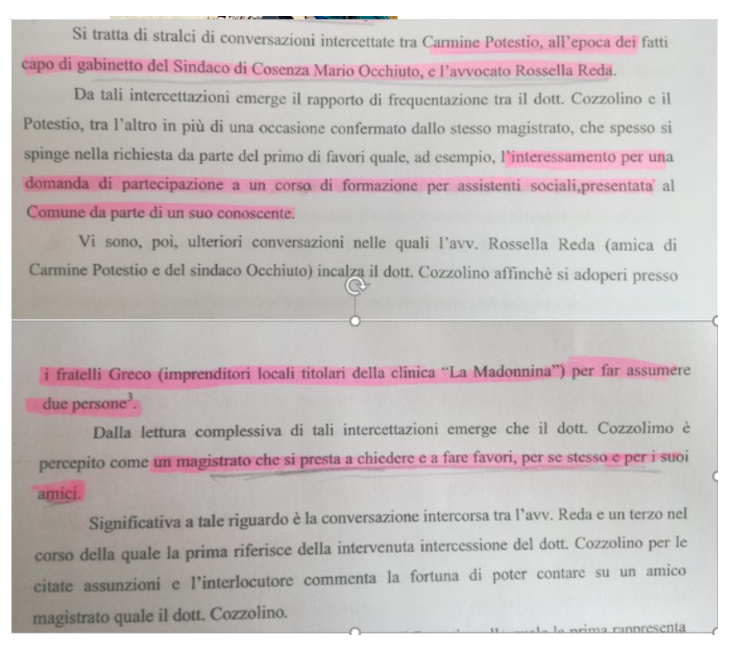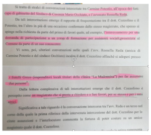 In una inchiesta in tre puntate (che aveva animato anche un’interrogazione parlamentare) era emerso tramite gli investigatori di Crotone che l’avvocato faceva da tramite sia tra Occhiuto e il pm Cozzolino, ma anche affinché lo stesso pm si adoperasse per alcune assunzioni nelle cliniche dei Greco (Qui l’ultima puntata: https://www.iacchite.blog/cosenza-in-mano-alla-massomafia-cozzolino-e-potestio-inciuciavano-anche-con-i-soliti-igreco-attraverso-rossella-reda/ )
