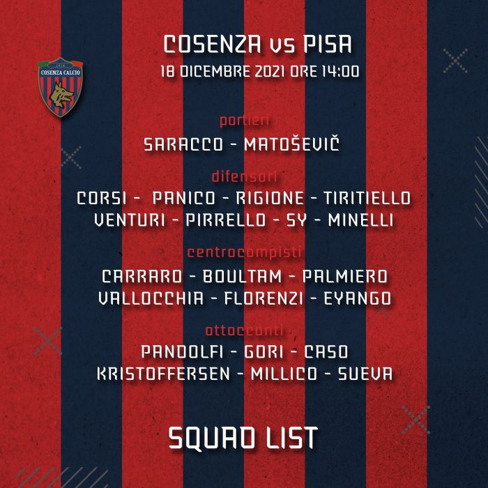 Diffusi anche i convocati per la gara di domani al Marulla contro il Pisa. Assenti Situm e Gerbo.