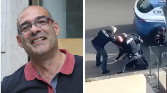 Lo bloccano. Lo costringono a terra. Uno degli agenti ha un ginocchio vicino alla schiena.