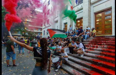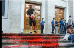 Vernice rossa versata sui gradini della Prefettura di Cosenza come simbolo del sangue palestinese e come accusa al Governo. È questa l’azione dimostrativa con cui i comitati ProPal hanno aperto il presidio organizzato dopo i raid di Tel Aviv su Gaza.
